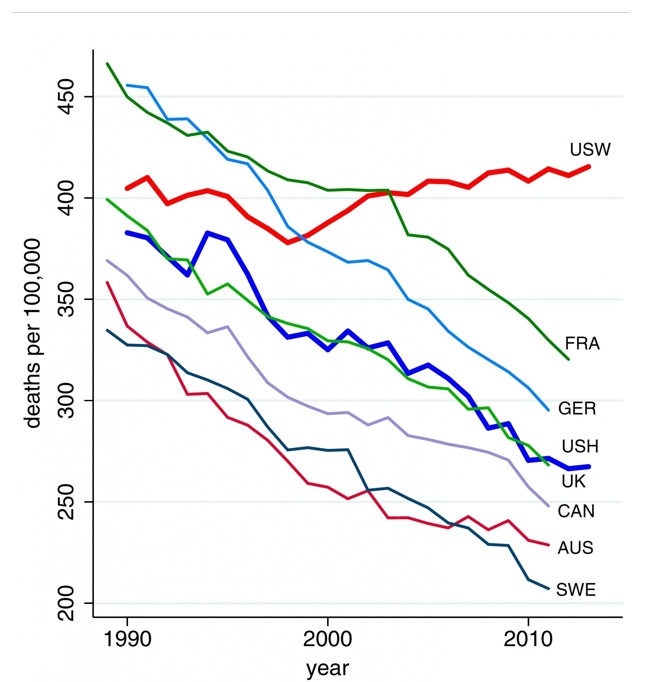 It's telling that the Deaton-Case study didn't delve into the correlation between the higher death rates of poor whites with residence in states opting out of Medicaid expansion under the Affordable Care Act. Liberal pundits are very fond of blaming higher mortality and morbidity among whites in red states on Republican governors and legislatures refusing to join in the expansion, even though it is initially being paid for by federal funds.